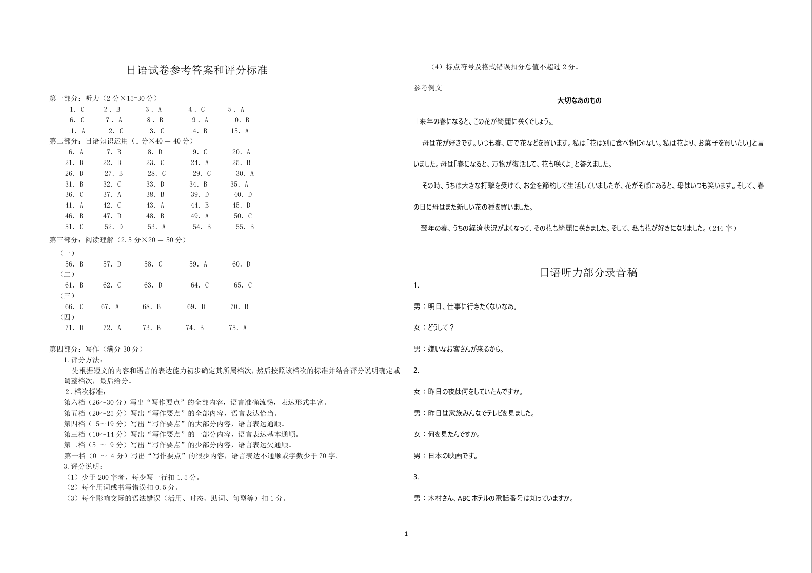 湖北省十堰市2023-2024学年高二上学期元月期末调研考试日语答案