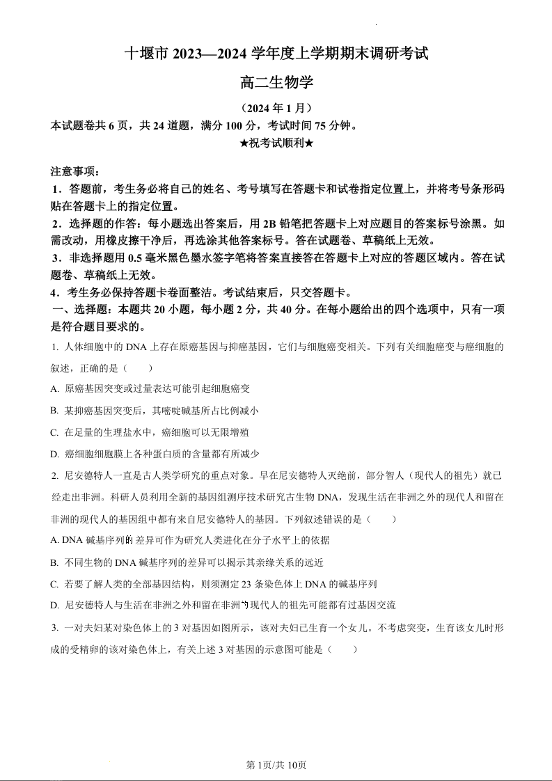 湖北省十堰市2023-2024学年高二上学期元月期末调研考试生物(原卷版)