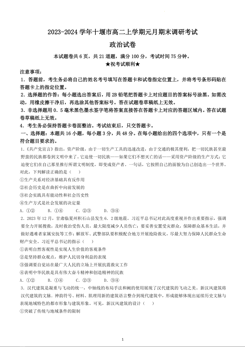 湖北省十堰市2023-2024学年高二上学期元月期末调研考试政治+答案