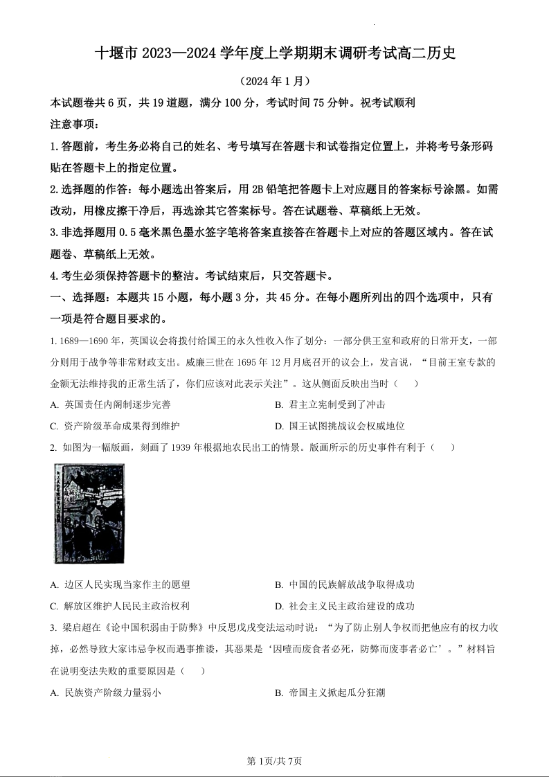 湖北省十堰市2023-2024学年高二上学期元月期末调研考试历史(原卷版)