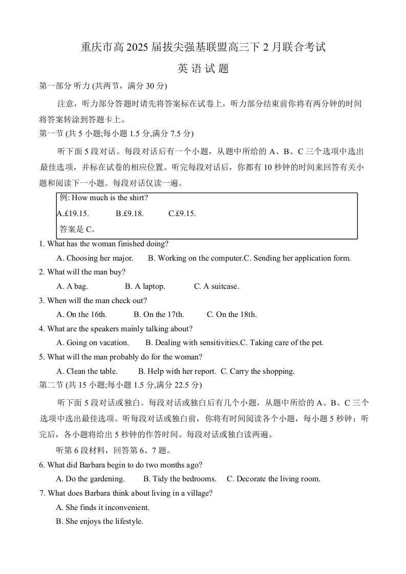 重庆市西南大学附中拔尖强基联盟2024-2025学年下学期2月高三考试英语