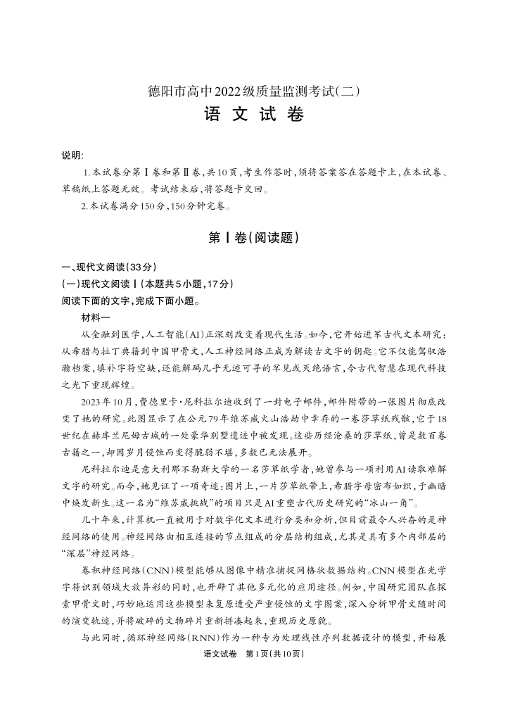 四川省德阳市高中2024-2025学年高三质量监测考试(二诊)语文