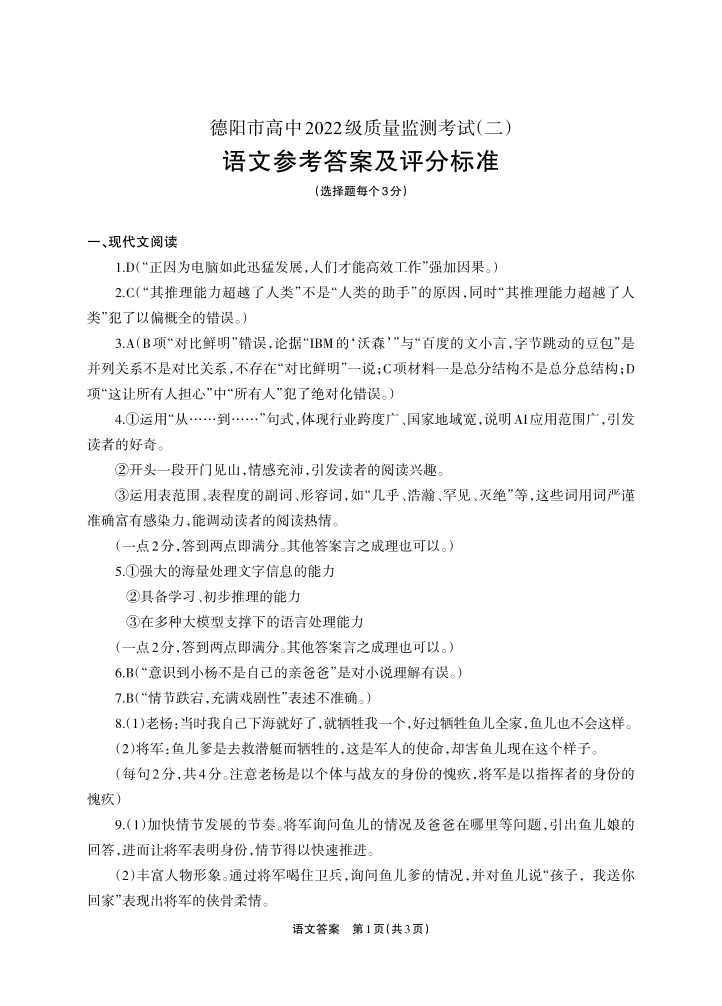 四川省德阳市高中2024-2025学年高三质量监测考试(二诊)语文答案