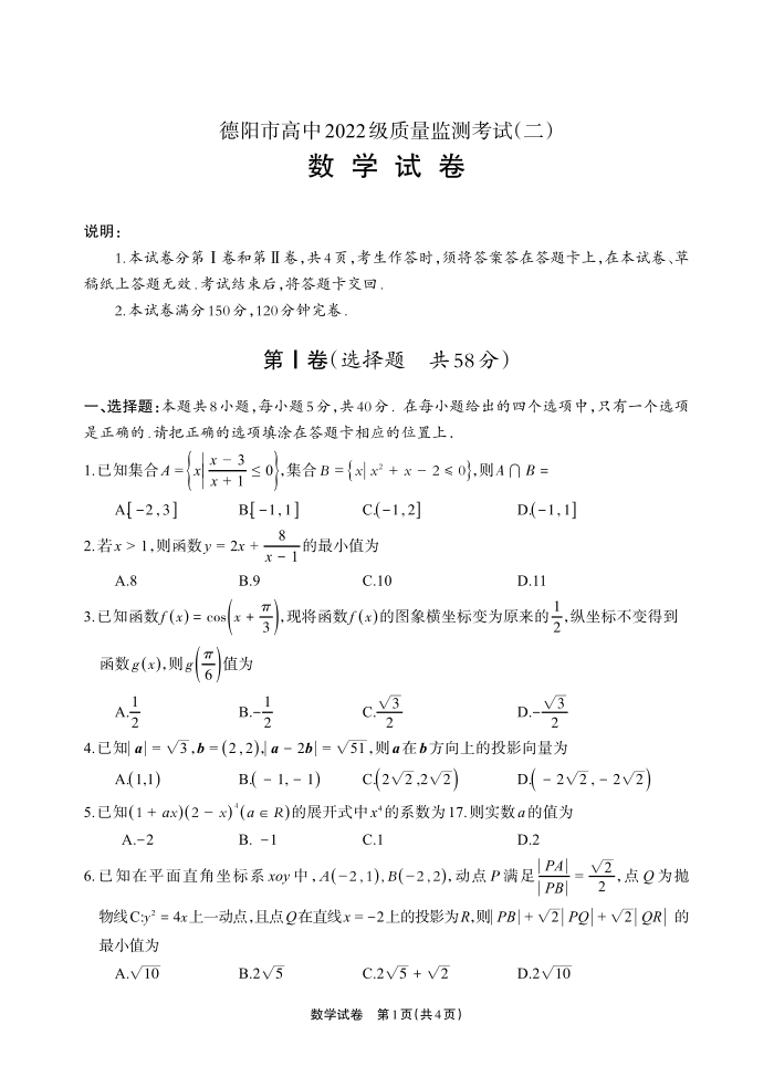 四川省德阳市高中2024-2025学年高三质量监测考试(二诊)数学