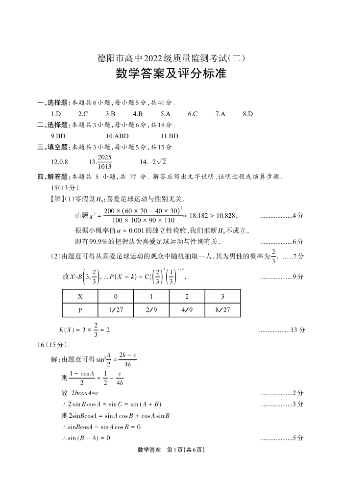 四川省德阳市高中2024-2025学年高三质量监测考试(二诊)数学答案