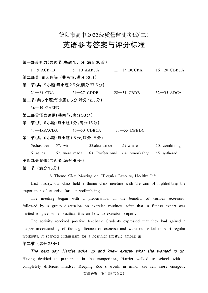 四川省德阳市高中2024-2025学年高三质量监测考试(二诊)英语答案