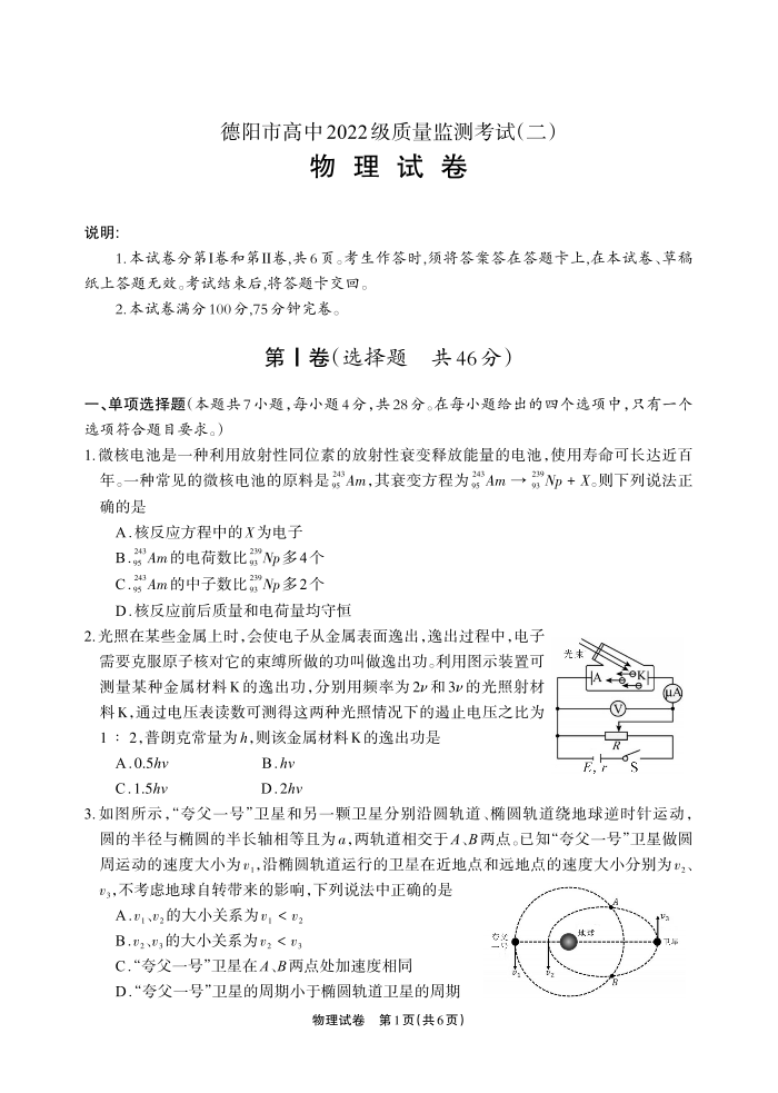 四川省德阳市高中2024-2025学年高三质量监测考试(二诊)物理