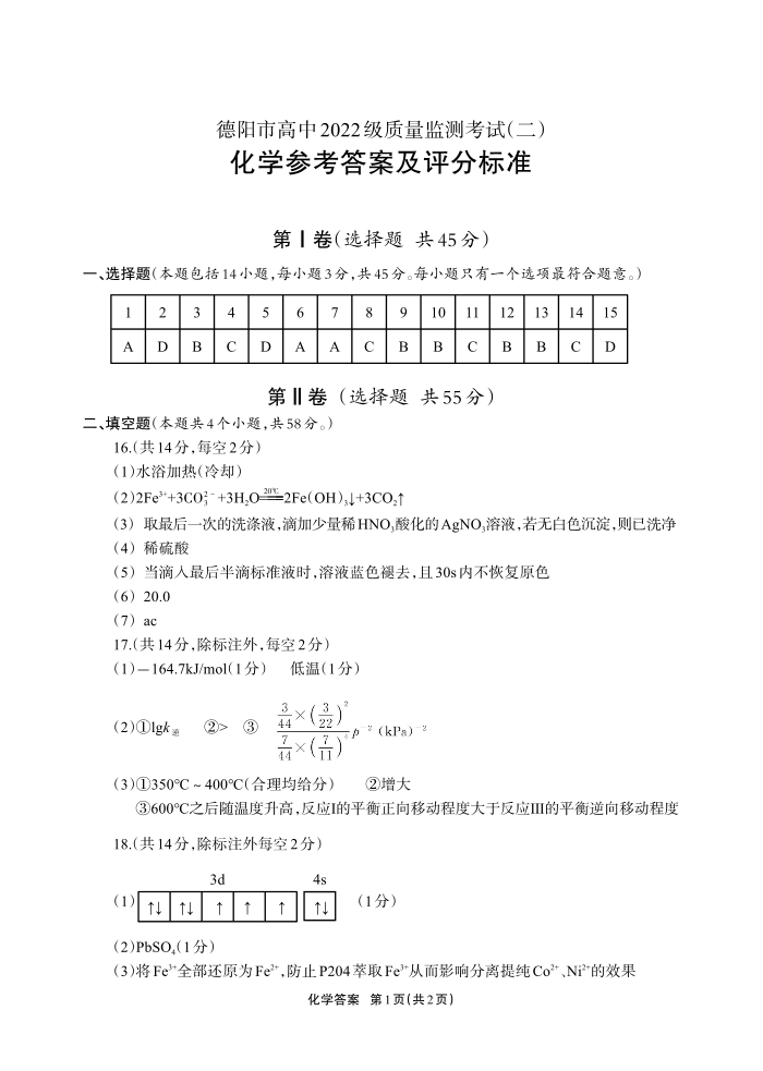 四川省德阳市高中2024-2025学年高三质量监测考试(二诊)化学答案