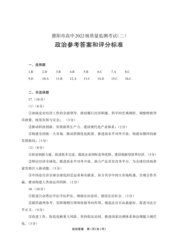 四川省德阳市高中2024-2025学年高三质量监测考试(二诊)政治答案
