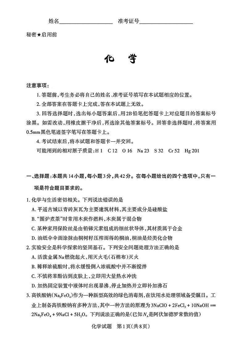山西省2024-2025学年下学期高三考前适应性测试启航卷(一模)化学+答案