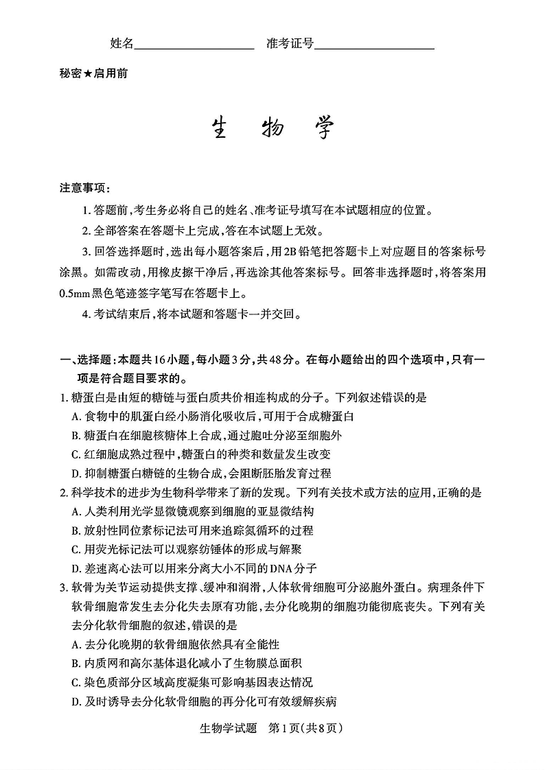 山西省2024-2025学年下学期高三考前适应性测试启航卷(一模)生物+答案
