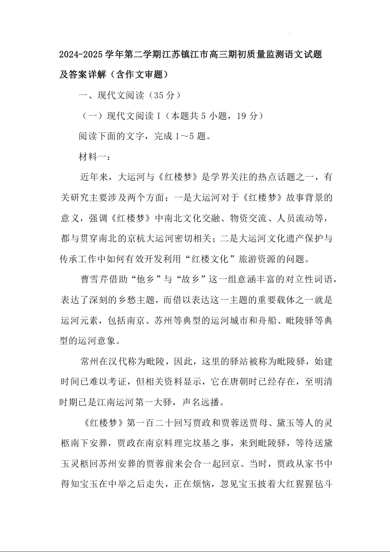 江苏省镇江市2024-2025学年下学期2月高三期初质量监测语文+答案