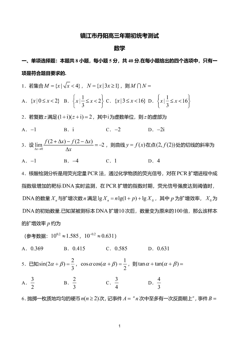 江苏省镇江市2024-2025学年下学期2月高三期初质量监测数学+答案