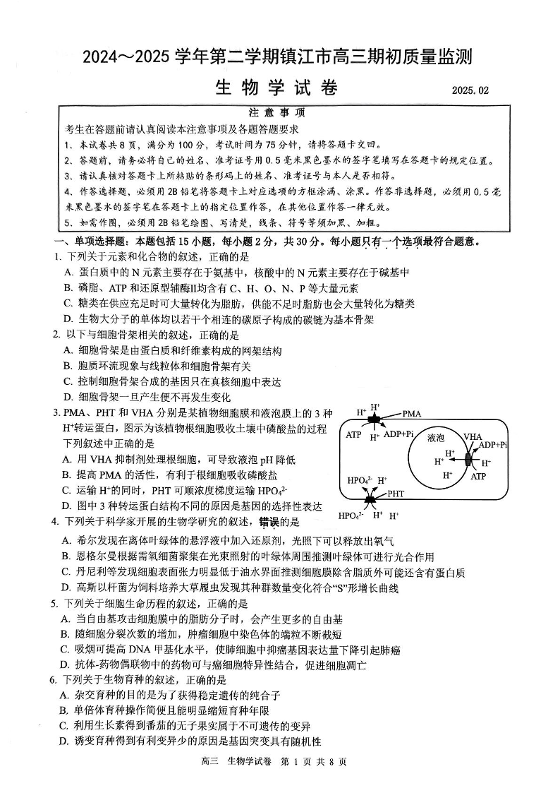 江苏省镇江市2024-2025学年下学期2月高三期初质量监测生物