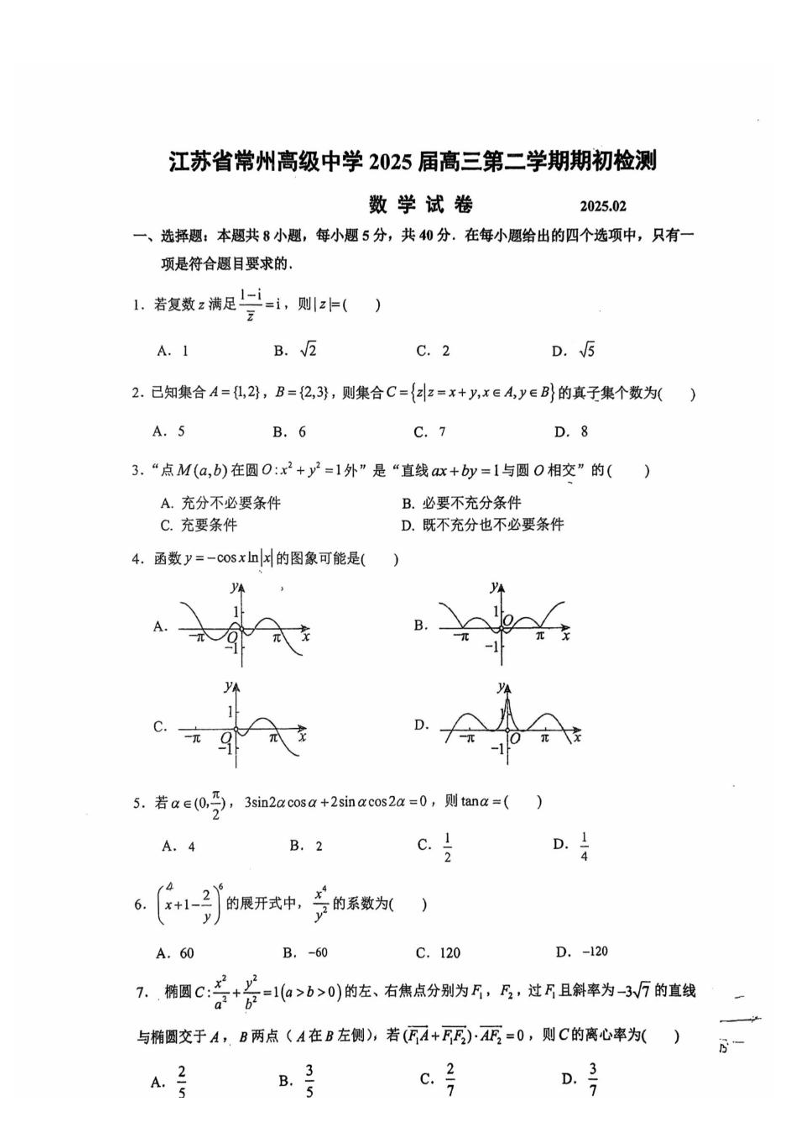 江苏省常州高级中学2024-2025学年下学期高三期初质量调研数学+答案
