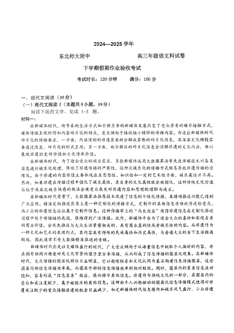 吉林省东北师大学附中2024-2025学年下学期2月高三开学考试语文+答案