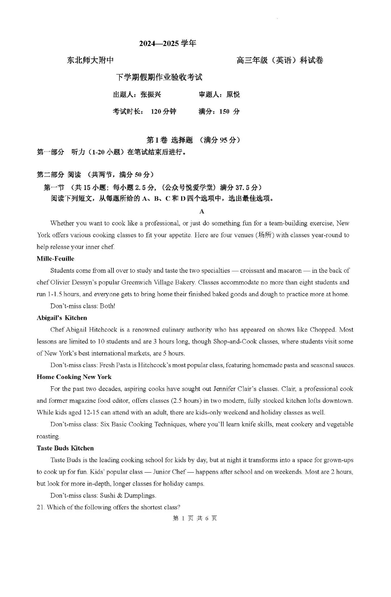 吉林省东北师大学附中2024-2025学年下学期2月高三开学考试英语+答案
