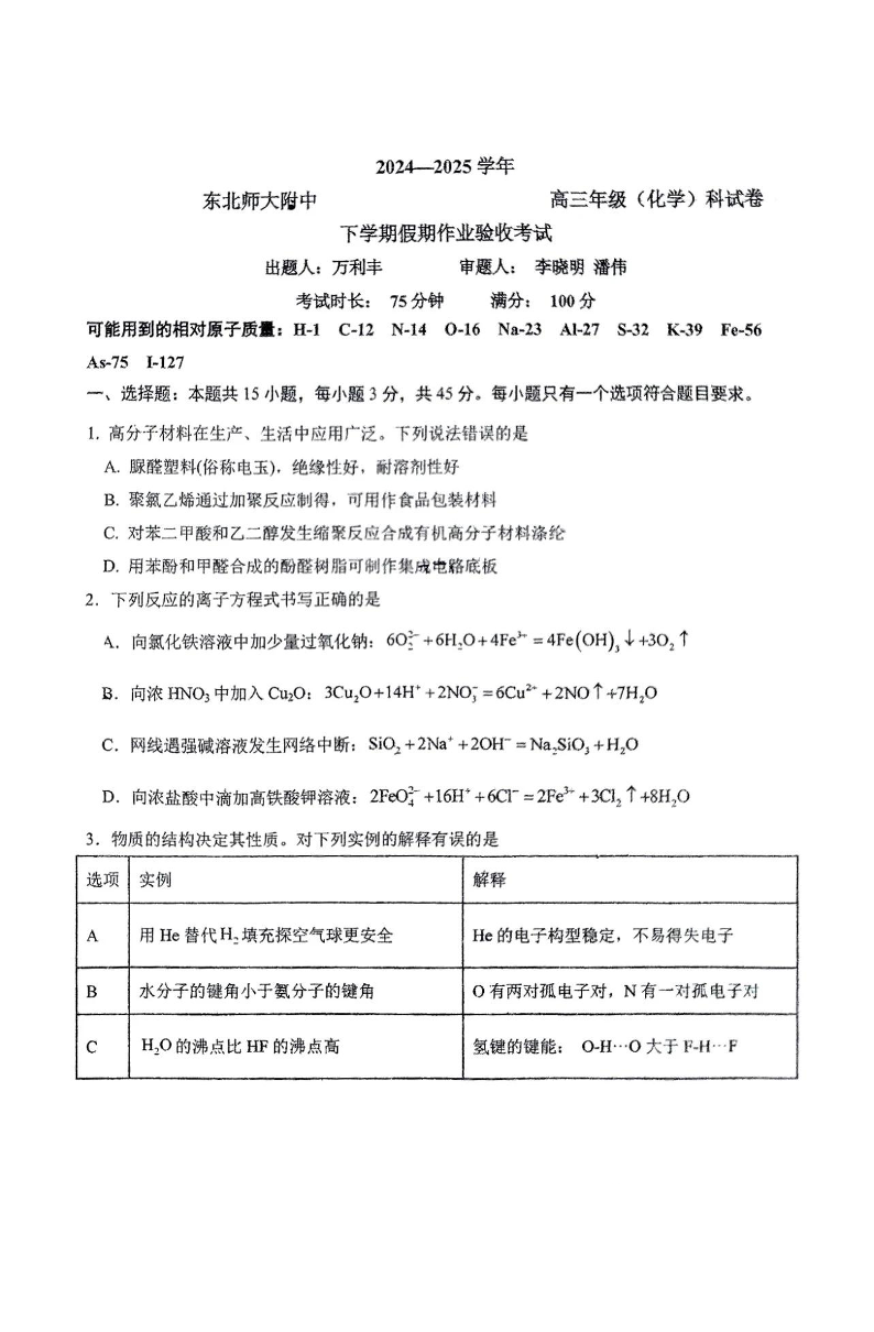 吉林省东北师大学附中2024-2025学年下学期2月高三开学考试化学+答案