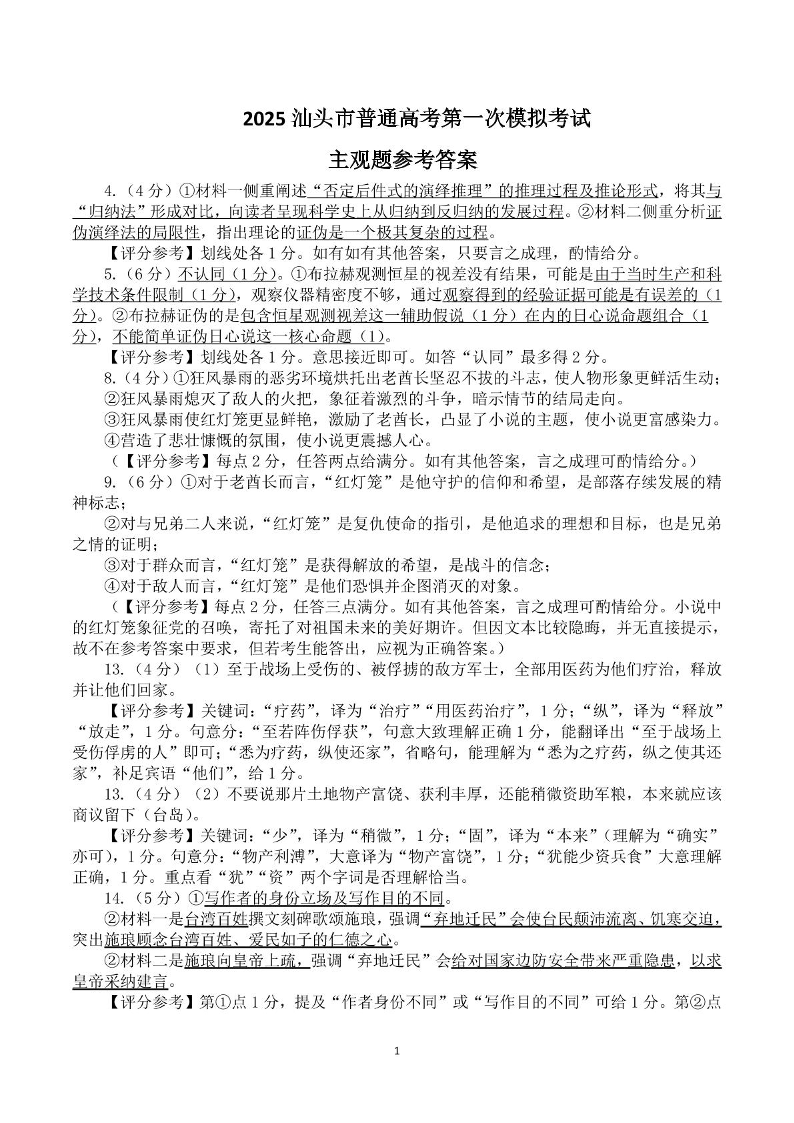 广东省汕头市2024-2025学年下学期2月第一次模拟考试(一模)语文主观题答案