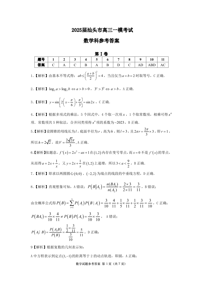 广东省汕头市2024-2025学年下学期2月第一次模拟考试(一模)数学答案