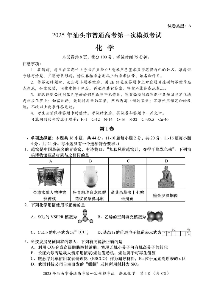 广东省汕头市2024-2025学年下学期2月第一次模拟考试(一模)化学