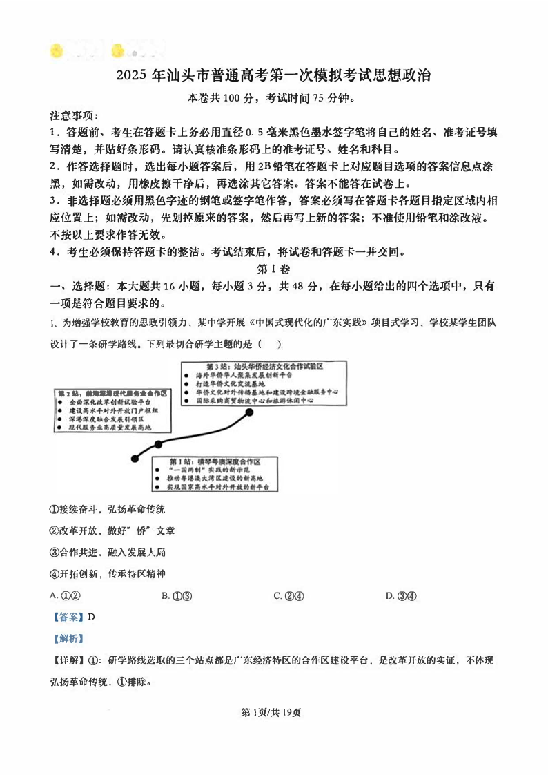 广东省汕头市2024-2025学年下学期2月第一次模拟考试(一模)政治(解析版)