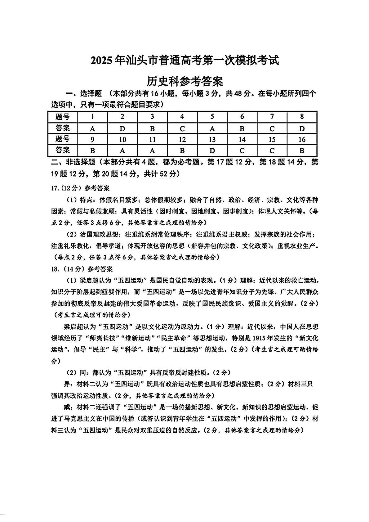广东省汕头市2024-2025学年下学期2月第一次模拟考试(一模)历史答案