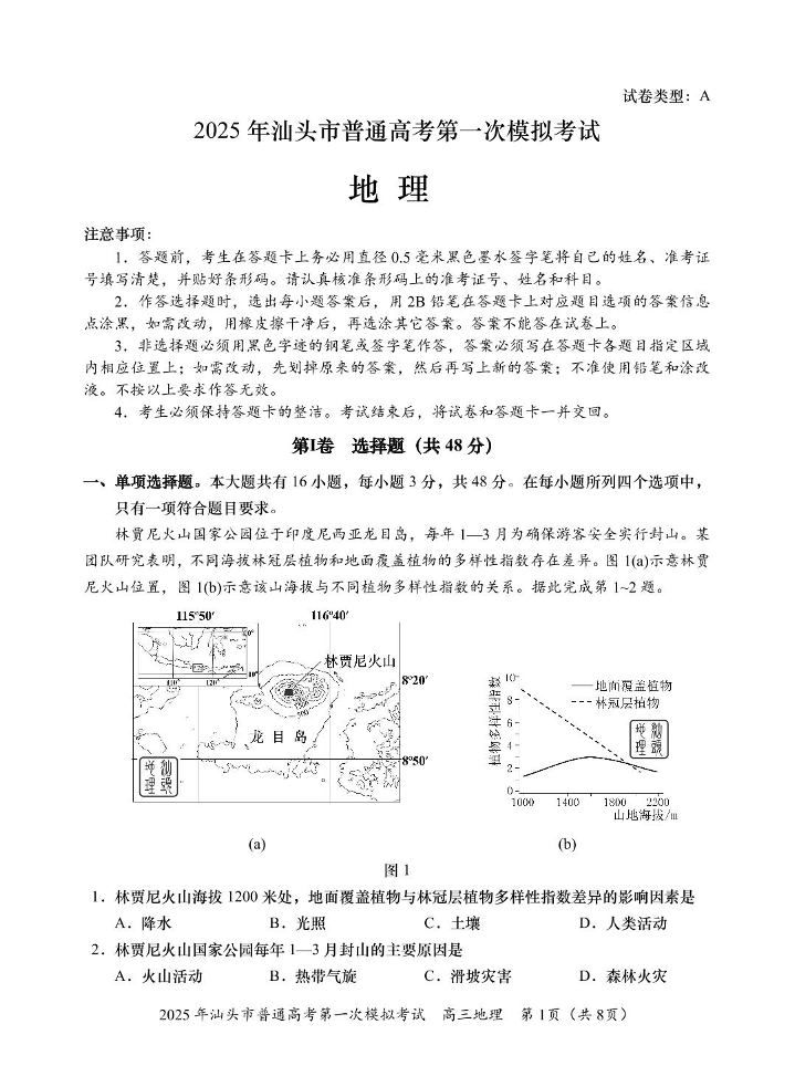 广东省汕头市2024-2025学年下学期2月第一次模拟考试(一模)地理