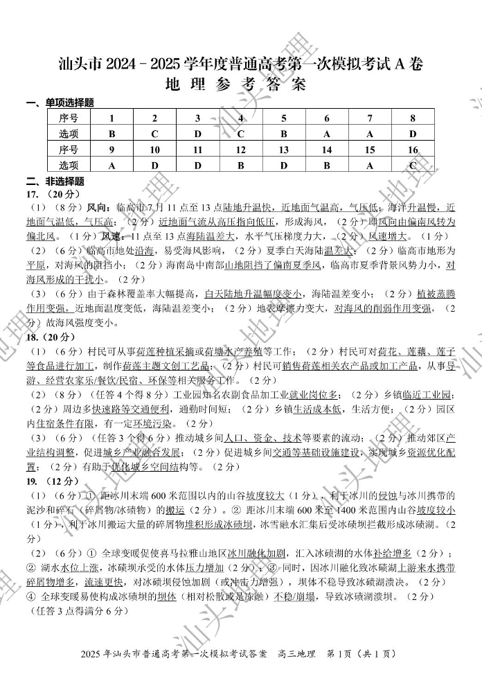 广东省汕头市2024-2025学年下学期2月第一次模拟考试(一模)地理答案
