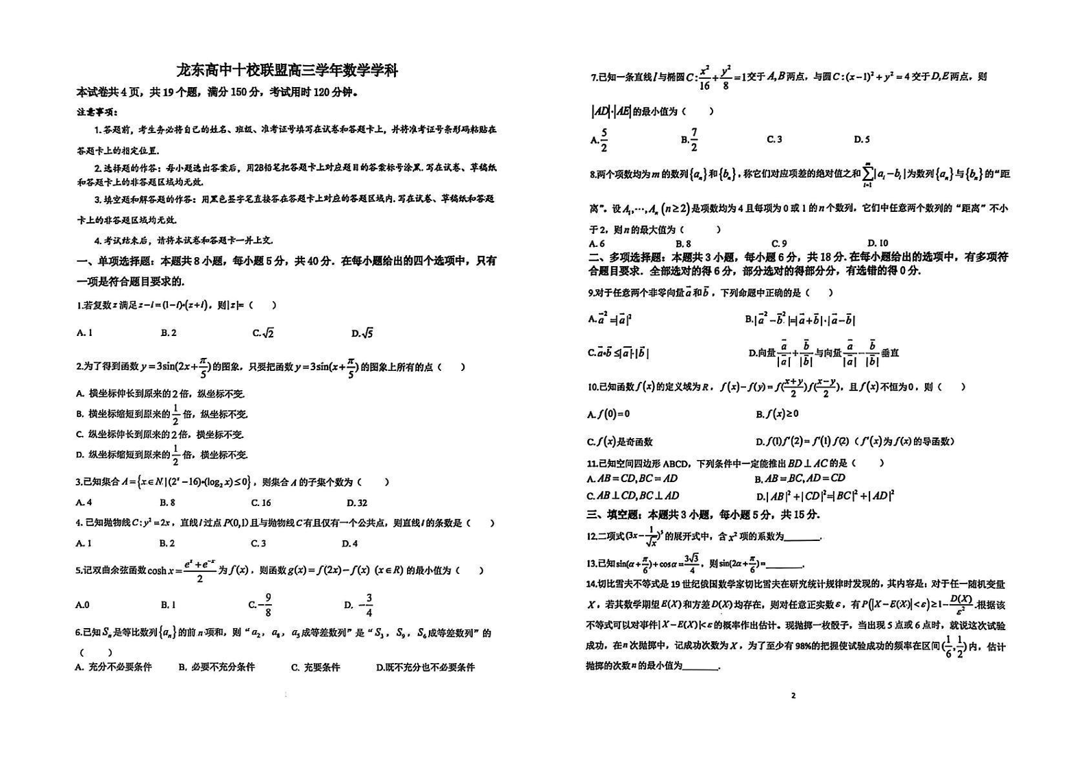 黑龙江省龙东高中十校联盟2024-2025学年下学期高三适应性考试数学
