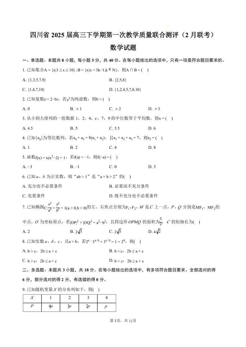 四川省区域2024-2025学年下学期2月高三第一次教学质量测评数学+答案