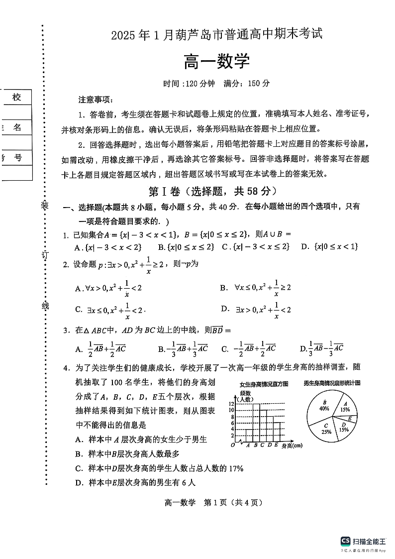 辽宁省葫芦岛市2024-2025学年高一上学期1月期末考试数学
