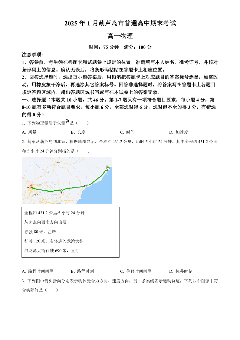 辽宁省葫芦岛市2024-2025学年高一上学期1月期末考试物理+答案