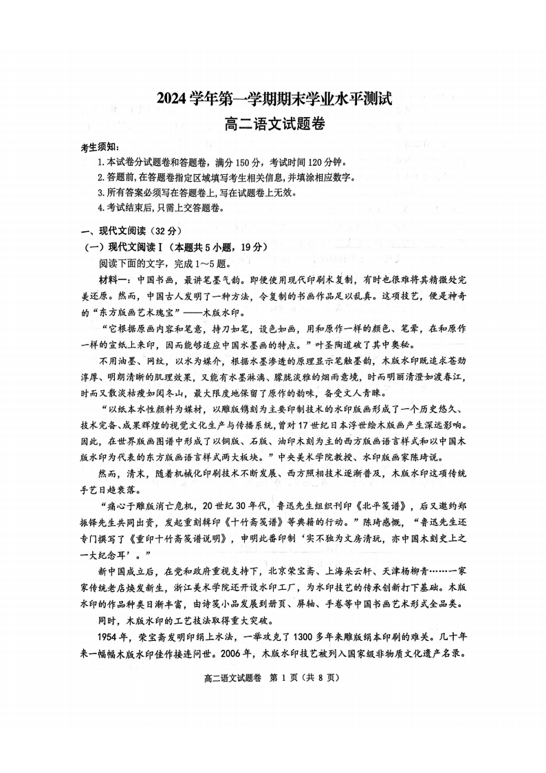 浙江省杭州市八县市2024-2025学年高二上学期期末学业水平测试语文+答案