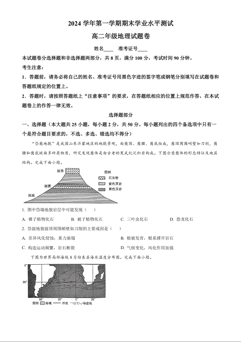 浙江省杭州市八县市2024-2025学年高二上学期期末学业水平测试地理+答案