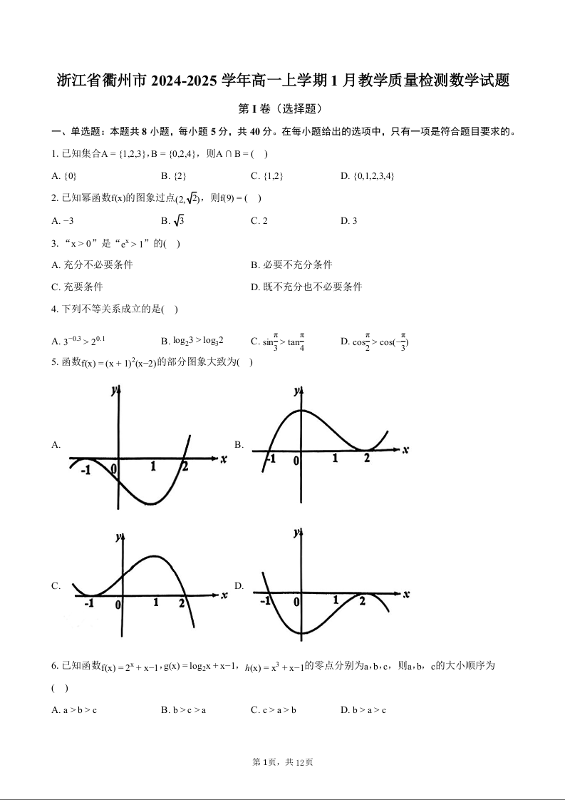 浙江省衢州市2024-2025学年高一上学期1月教学质量检测数学+答案