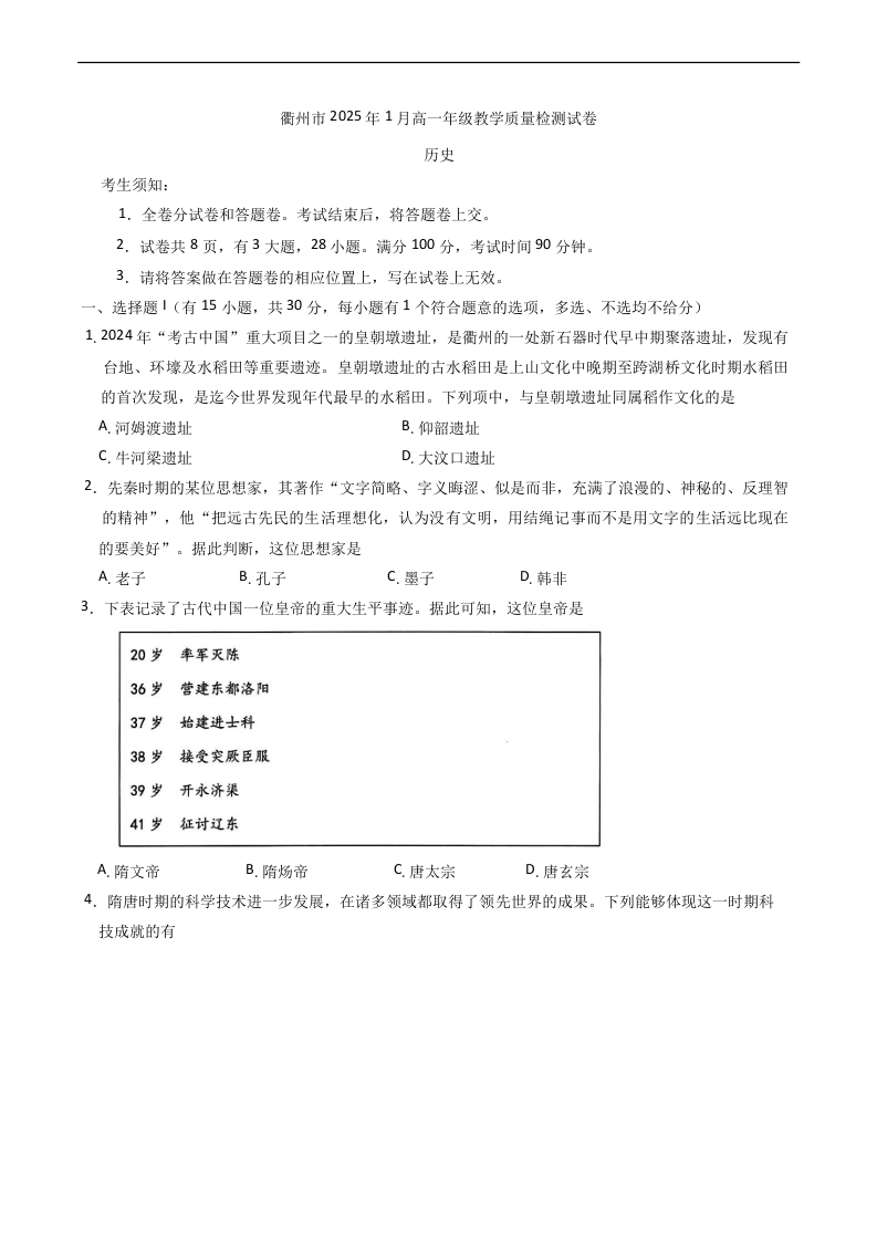 浙江省衢州市2024-2025学年高一上学期1月教学质量检测历史+答案