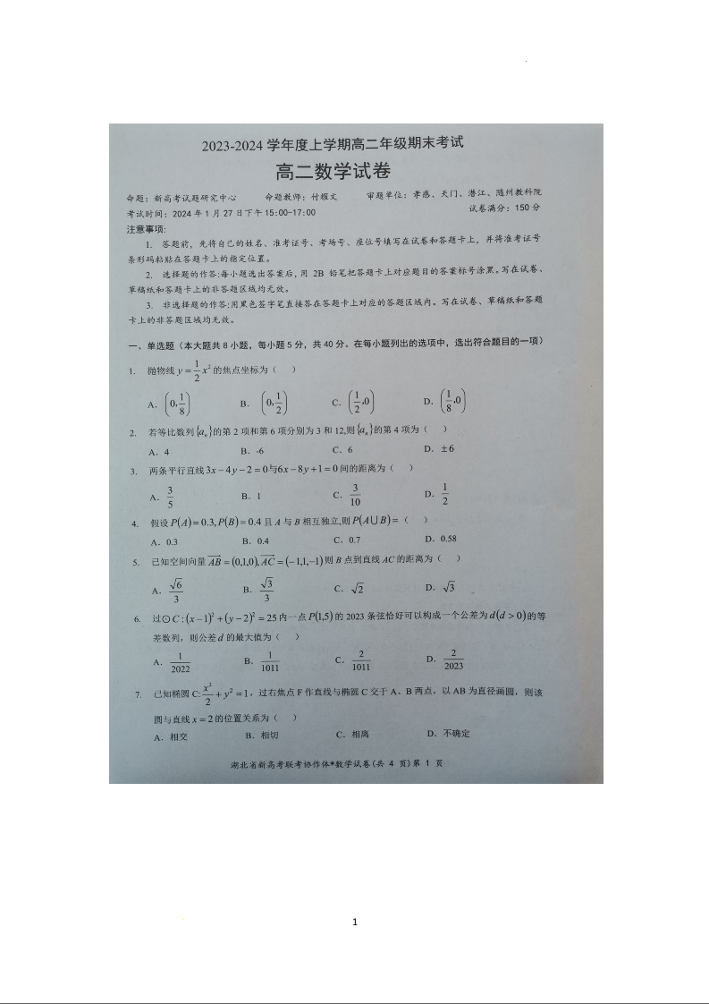 湖北省新高考联考协作体2023-2024学年高二上学期1月期末考试数学