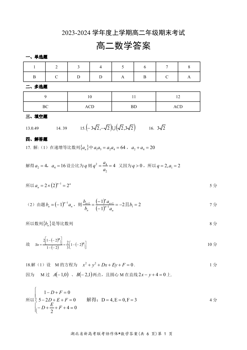 湖北省新高考联考协作体2023-2024学年高二上学期1月期末考试数学答案