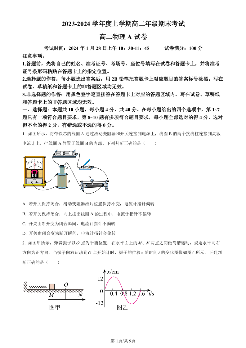 湖北省新高考联考协作体2023-2024学年高二上学期1月期末考试物理+答案