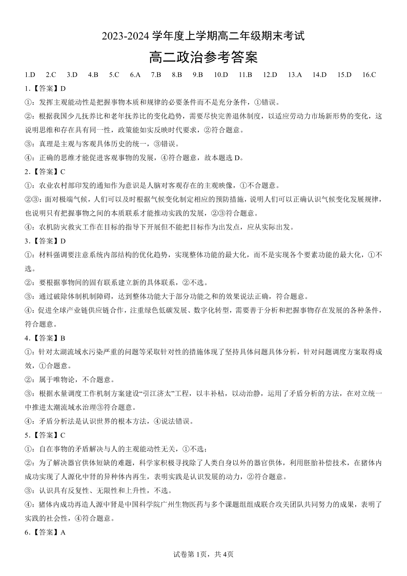 湖北省新高考联考协作体2023-2024学年高二上学期1月期末考试政治答案