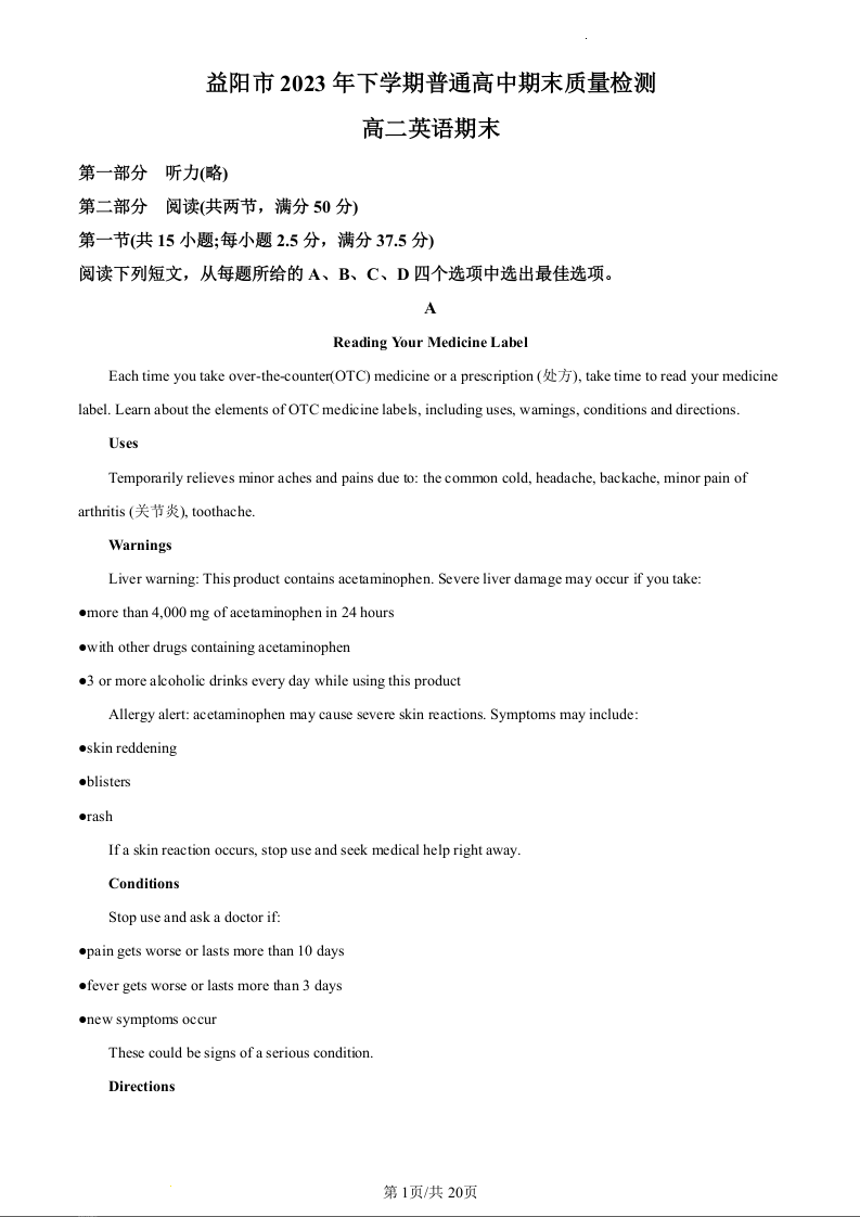 湖南省益阳市2023-2024学年高二上学期普通高中期末质量检测英语(精品解析版)