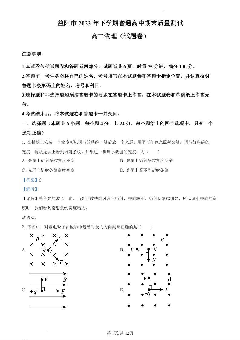湖南省益阳市2023-2024学年高二上学期普通高中期末质量检测物理(精品解析版)