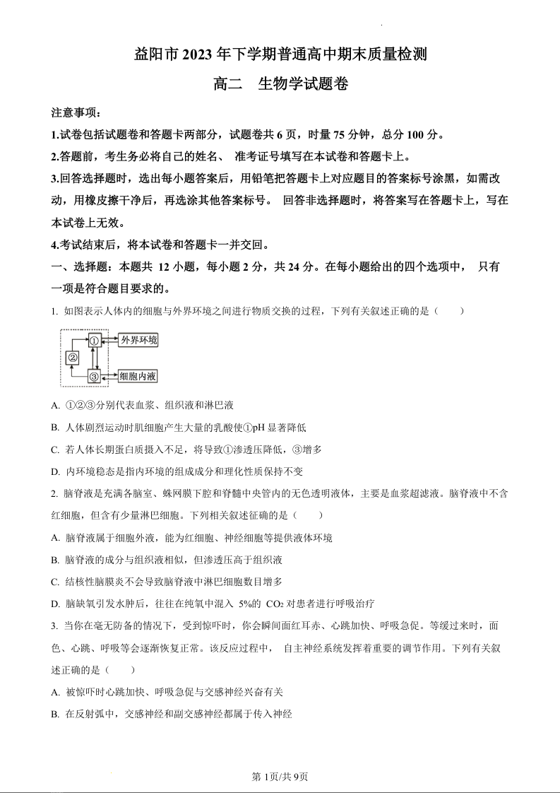 湖南省益阳市2023-2024学年高二上学期普通高中期末质量检测生物(原卷版)