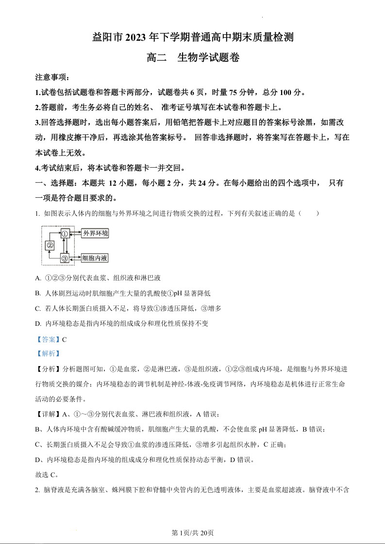 湖南省益阳市2023-2024学年高二上学期普通高中期末质量检测生物(精品解析版)