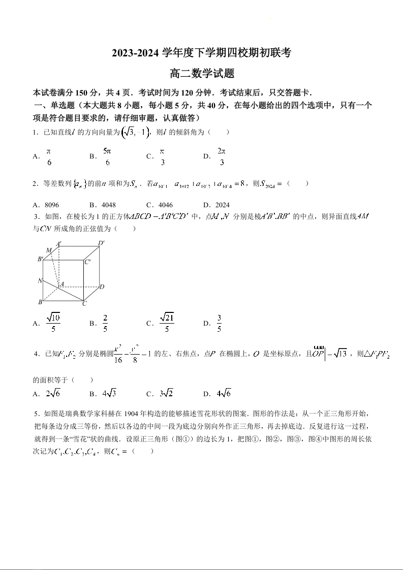 吉林省四校2023-2024学年高二下学期开学联考数学+答案