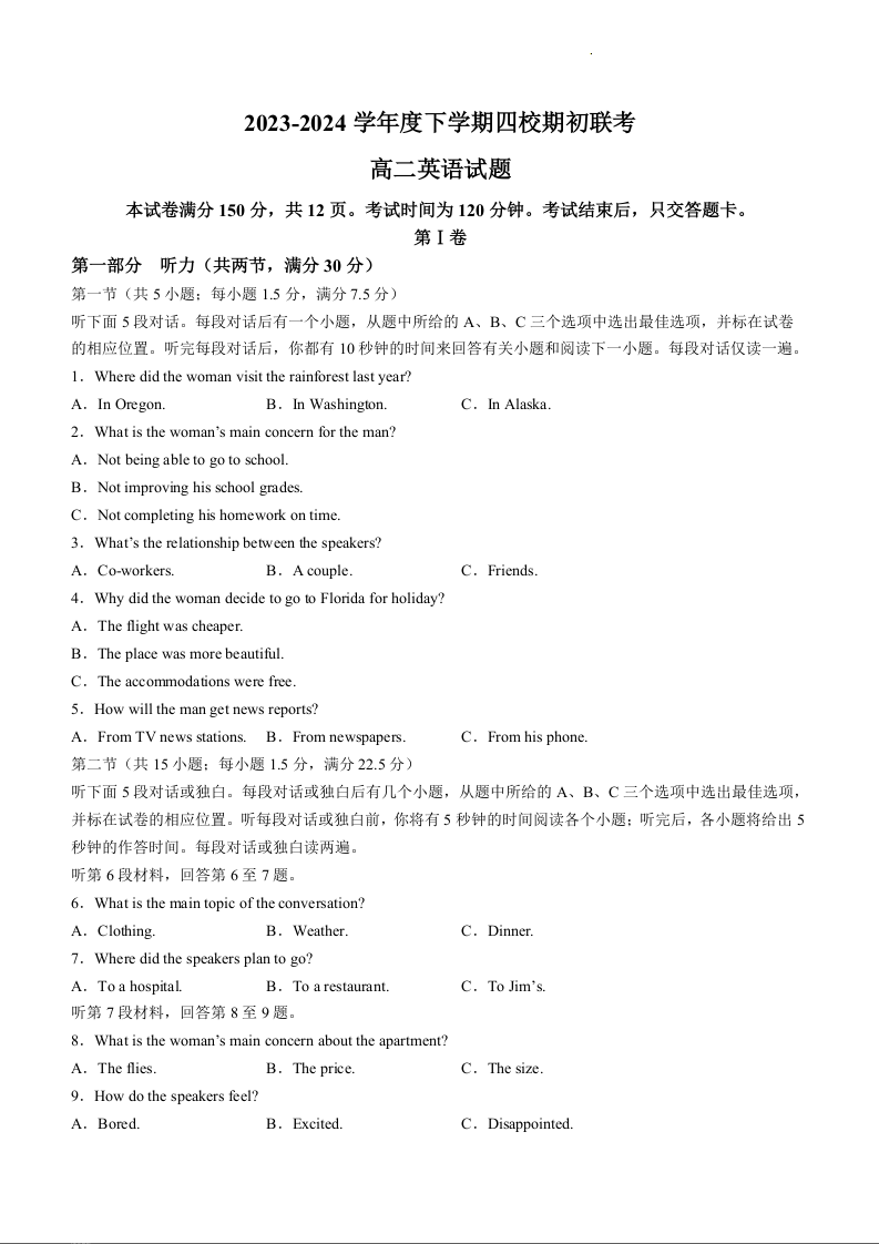 吉林省四校2023-2024学年高二下学期开学联考英语+答案
