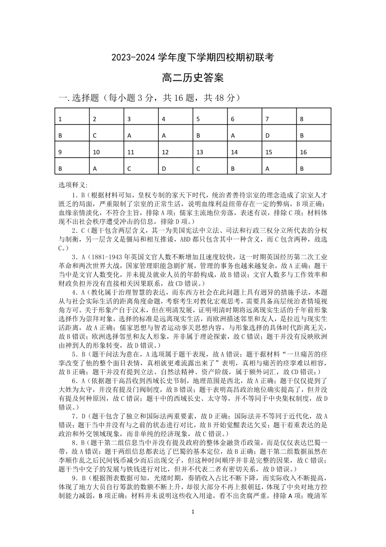 吉林省四校2023-2024学年高二下学期开学联考历史答案
