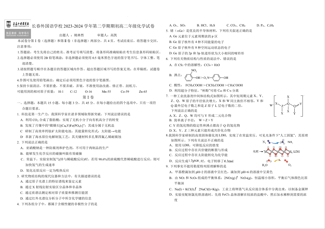 吉林省长春市朝阳区长春外国语学校2023-2024学年高二下学期开学考试化学+答案