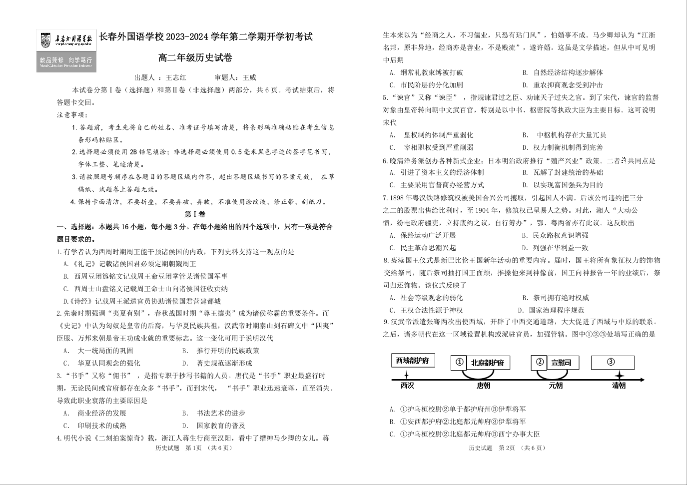 吉林省长春市朝阳区长春外国语学校2023-2024学年高二下学期开学考试历史+答案